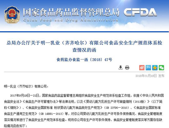 这是2018年明一乳业第二次上黑榜了,1月19日晚,国家食药监总局通报婴幼儿配方乳粉企业生产规范体系检查情况,明一国际旗下明一乳业(齐齐哈尔)有限公司、明一乳业(富裕)有限公司被审计出多项生产管理缺陷,涉及黄曲霉毒素M1检验原料重复使用、将含量不符合标准规定的原料判定为合格品、不同检验人员“共用”同一毕业证书编号等问题。